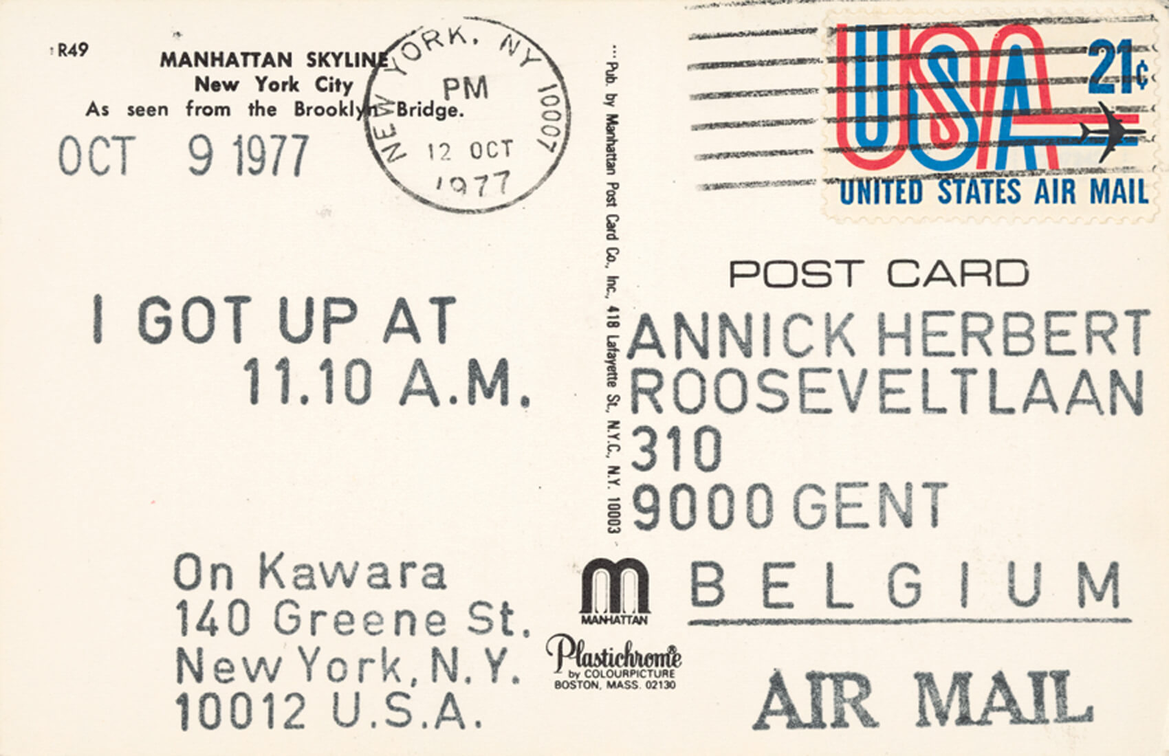 Postkaart, deel van een reeks van 62 postkaarten, verzonden aan Annick Herbert tussen 4 oktober en 4 december 1977 (recto)I got Up,